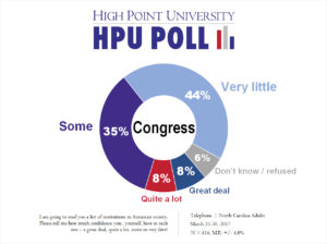 The most recent HPU Poll was fielded by live interviewers at the High Point University Survey Research Center calling on March 25 through 30, 2017. The responses from a sample of all North Carolina counties came from 416 adults with landline or cellular telephones. The survey has an estimated margin of sampling error of approximately 4.8 percentage points for all adult respondents. The data is weighted toward population estimates for cellular and landline telephone use, age, gender, and race. In addition to sampling error, factors such as question wording and other methodological choices in conducting survey research can introduce additional error into the findings of opinion polls. Details from this survey are available at