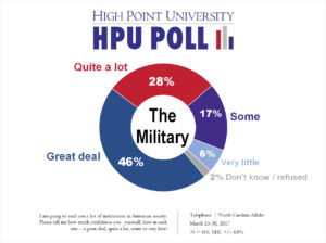 “While North Carolinians are nearly evenly divided on whether or not President Trump receives fair media coverage, the HPU poll also found that the same North Carolinians feel that media coverage is generally fair when it comes to other political figures and institutions, including the General Assembly and Gov. Roy Cooper,” says Dr. Martin Kifer, associate professor of political science and director of the HPU Poll. “The poll also asked participants to determine their confidence in various American institutions and found that confidence is highest in the military and lowest in Congress.”