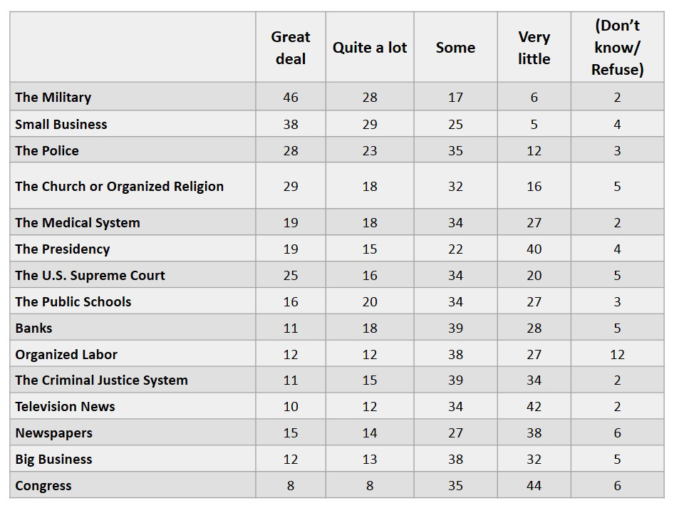 The lowest confidence ratings went to Congress (8 percent), television news (10 percent), the criminal justice system (11 percent), banks (11 percent), big business (12 percent), and organized labor (12 percent). The medical system, presidency, public schools, and newspapers were somewhere in between in terms of confidence.