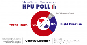 HIGH POINT, N.C., Oct. 2, 2020 – A new High Point University Poll finds that registered voters in North Carolina give President Donald Trump a job approval rating of 44% with half (50%) of North Carolina registered voters saying they disapprove of the job Trump is doing as president.