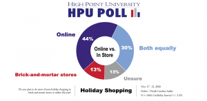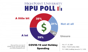 “Most of the North Carolinians we surveyed will spend the same or less than last year on the holidays,” says Brian McDonald, associate director of the HPU Poll and adjunct professor. “And a majority of poll respondents told us that COVID-19 has affected their holiday shopping this year in some regard.”