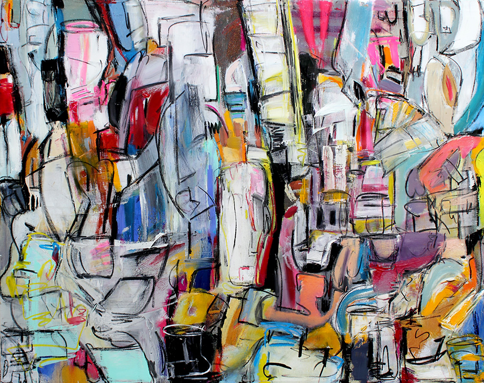 “With unabashed freedom, Sultan incorporates brilliant splashes of rich color, flat planes, the subtle variance of textured grays and elegant childlike lines in her paintings and drawings,” says Maxine Campbell, director and curator of the Sechrest Gallery.
