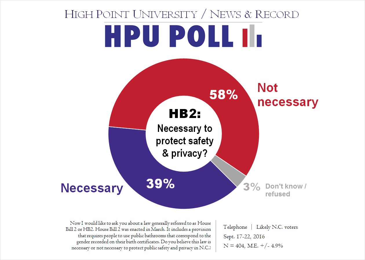 HIGH POINT, N.C., Sept. 28, 2016 – The recent High Point University/News & Record Poll looked at how likely voters in North Carolina feel about several major issues in this year’s election, including the controversial House Bill 2, voter ID requirement, education and teacher pay.