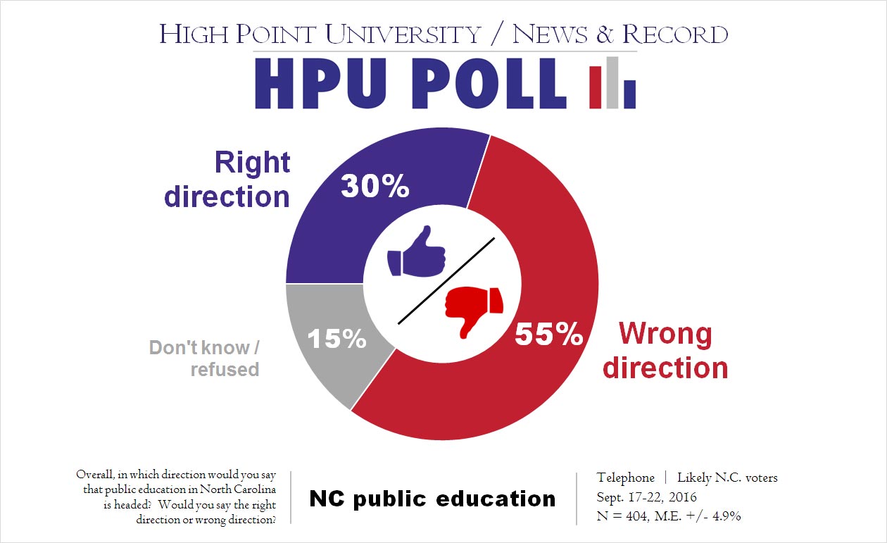 A majority of these likely voters, 55 percent, say that education is moving in the wrong direction, while 30 percent say it was headed in the right direction.
