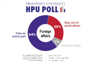 HIGH POINT, N.C., Feb. 10, 2017 – The first HPU Poll of 2017 finds that the majority of North Carolinians want the U.S. to take an active role in world affairs, and perceive North Korea and Russia as major threats.