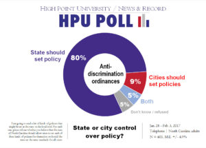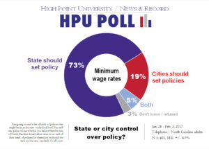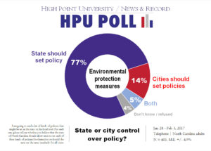 HIGH POINT, N.C., Feb. 8, 2017 – The first High Point University/News and Record Poll of 2017 finds that North Carolinians generally favor the state government establishing a statewide standard on a series of policy issues, including discrimination, minimum wage, and environmental protection, instead of cities making their own rules.