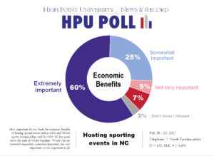 HIGH POINT, N.C., March 1, 2017 – The second High Point University and News and Record Poll of 2017 finds that most North Carolinians believe that hosting high profile sporting events brings important benefits to North Carolina’s economy and image. Majorities are concerned about the economic impact of HB2, yet the same North Carolina residents are split over whether local governments should be able to pass their own anti-discrimination ordinances. A majority of North Carolina residents approve of the North Carolina Senate exercising its constitutional power to approve Governor Cooper’s cabinet officials.