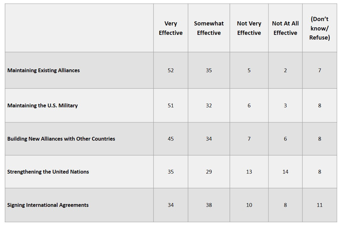 How effective do you think each of the following approaches is to achieving the foreign policy goals of the United States: very effective, somewhat effective, not very effective or not effective at all?