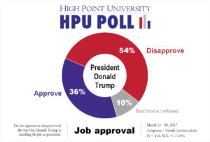 HIGH POINT, N.C., April 4, 2017 – The third High Point University Poll of 2017 finds that North Carolinians give President Donald Trump the same job approval rating of 36 percent they gave in earlier polls this year. They also give Gov. Roy Cooper a rating of 49 percent approval and continue to say in large numbers that the country is headed in the wrong direction.