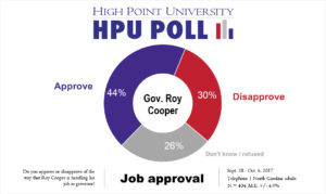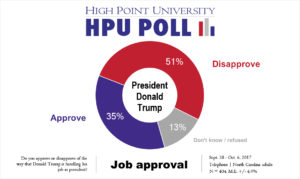 HIGH POINT, N.C., Oct. 9 – The first High Point University Poll of fall 2017 finds that about a third of North Carolinians (35 percent) approve of how President Donald Trump is doing his job and give Gov. Roy Cooper an approval rating of 44 percent. Meanwhile, a large majority continue to express concern that the country is on the wrong track.