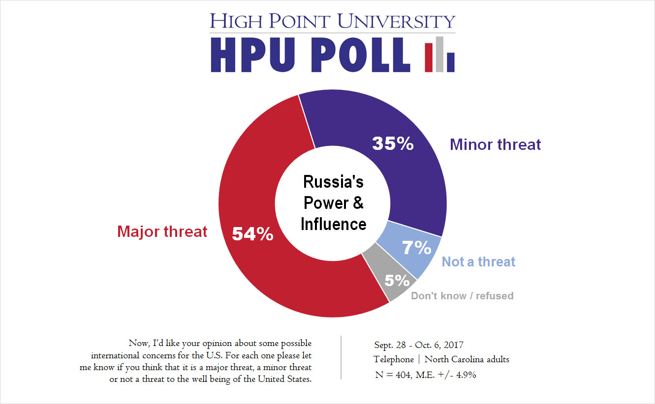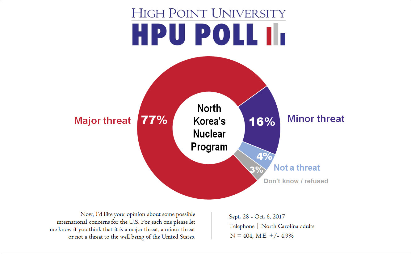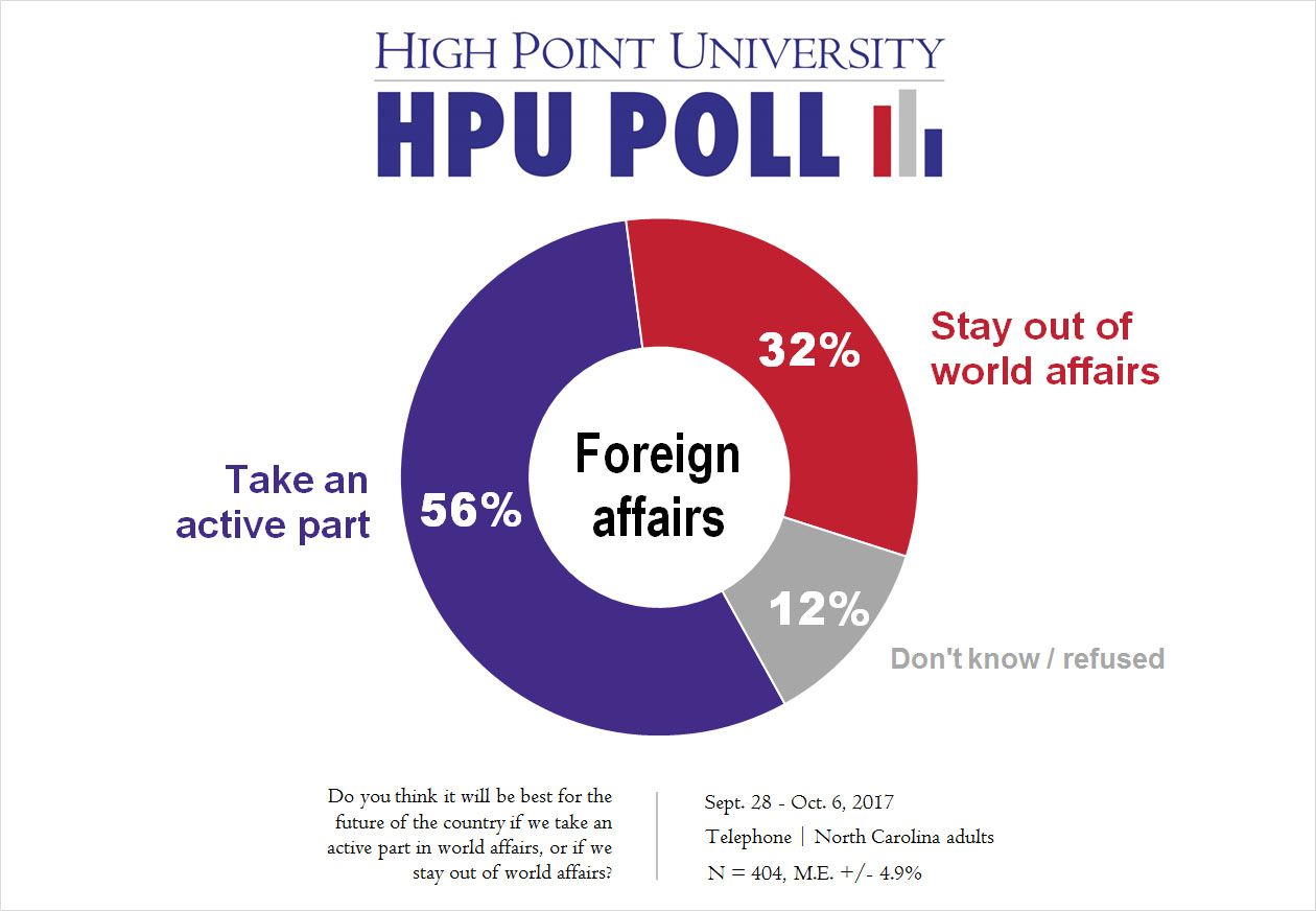 HIGH POINT, N.C., Oct. 11, 2017 – The High Point University Poll finds a majority of North Carolinians in favor of the U.S. taking an active role in world affairs, with their top concerns including ISIS, North Korea and Russia as major threats to U.S. security.