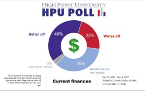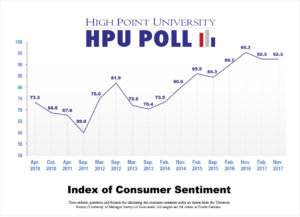 HIGH POINT, N.C., Nov. 7, 2017 – North Carolinians remain optimistic about major economic indicators such as their personal finances, according to the High Point University Poll’s latest Consumer Sentiment Index.
