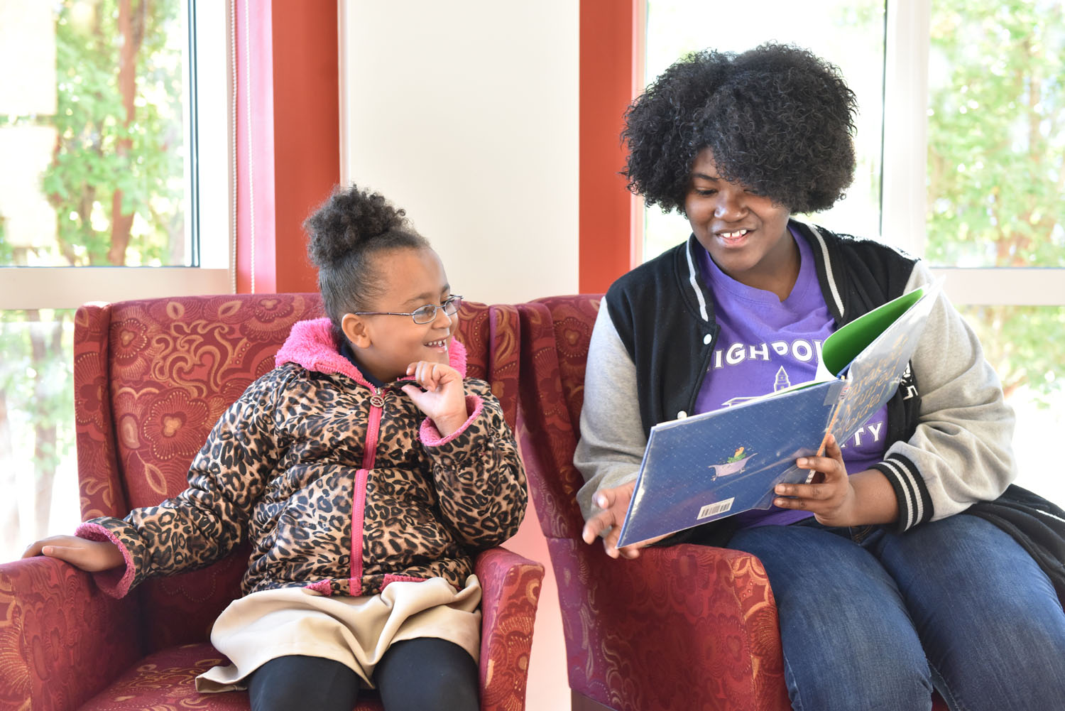 She carried it over to her Book Buddy, HPU junior Brianna Beard, and tore away at the wrapping paper to reveal her favorite book, “Stephanie’s Ponytail,” by Robert Munsch.