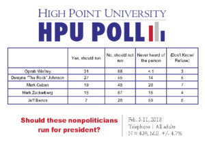 There also is not a groundswell of support for any of the nonpoliticians mentioned in the HPU Poll. Less than one-third (31 percent) of North Carolinians say Oprah Winfrey should run for president, while almost two-thirds (66 percent) specifically say she should not run. Similarly, few North Carolina residents support other nonpoliticians mentioned in media reports as possible candidates like former professional wrestler and actor Dwayne “The Rock” Johnson (27 percent), internet billionaire and television star Mark Cuban (19 percent), Facebook founder Mark Zuckerberg (15 percent), and Amazon founder Jeff Bezos (7 percent).