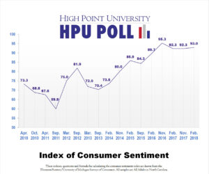 HIGH POINT, N.C., March 1, 2018 – According to the latest HPU Poll, the Consumer Sentiment Index shows that North Carolinians’ opinion about the economy and their personal finances remains relatively unchanged over the past year.