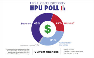 “North Carolinians are a little more optimistic about the economy this year than they were a year ago,” says Brian McDonald, associate director of the HPU Poll and adjunct instructor. “The latest poll continues to show a positive trend in consumer sentiment here in North Carolina.”