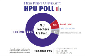 HIGH POINT, N.C., March 7, 2018 – A High Point University Poll finds majorities of North Carolinians agree on a series of education issues despite the partisanship and polarization that dominates some political discussions. Relatively large majorities of North Carolinians say most people have respect for teachers and school administrators, are willing to pay more in taxes to boost teacher salaries, and support a bond referendum to build and renovate state schools, as well as other possible education policy priorities.