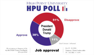 HIGH POINT, N.C., Feb. 27, 2018 – A High Point University Poll finds that North Carolinians give President Donald Trump a job approval rating of 38 percent. Meanwhile, a majority (57 percent) continue to say the country is headed in the wrong direction.
