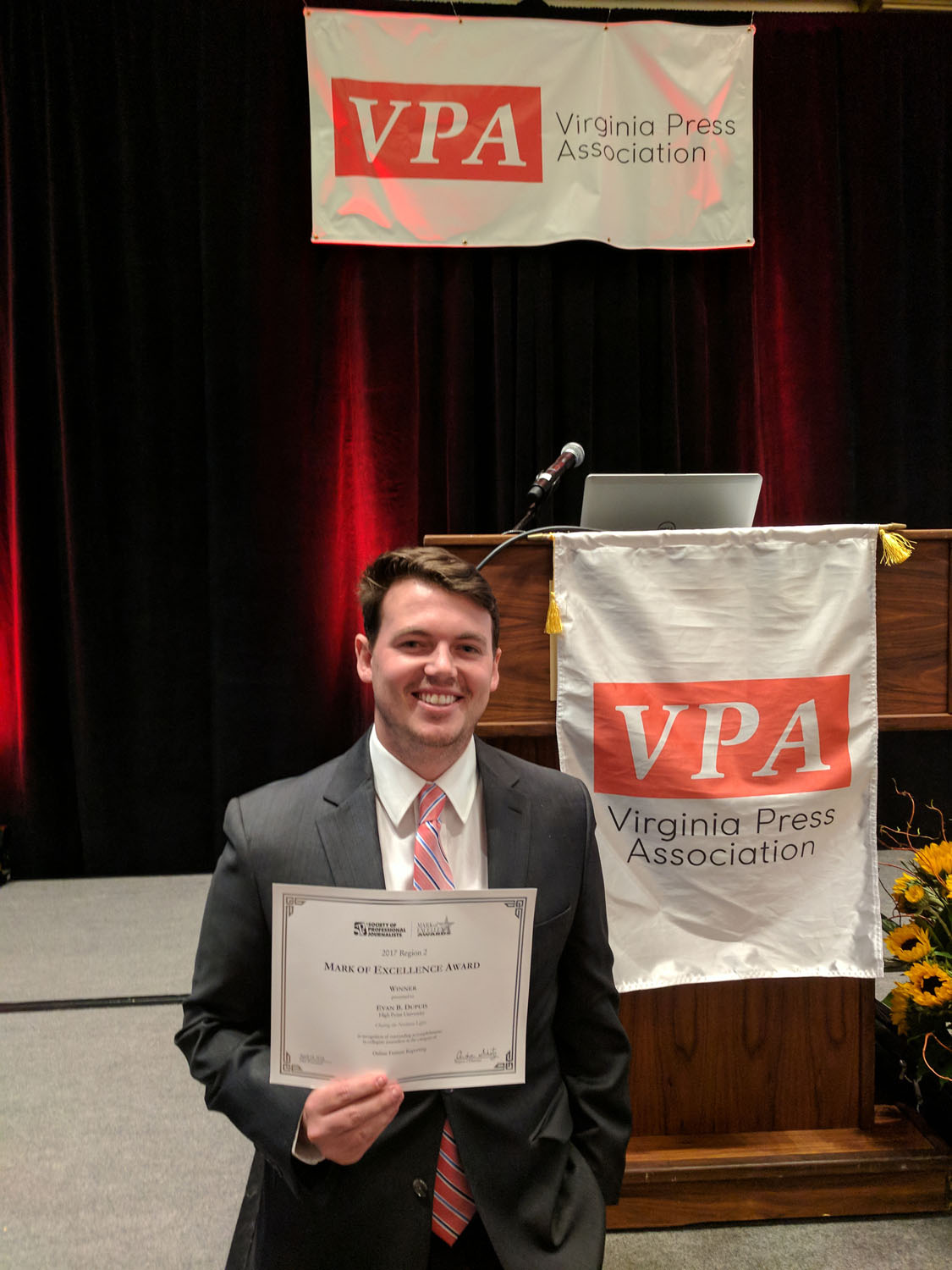 Evan Dupuis, a 2018 graduate, won the Mark of Excellence Award for online feature reporting at the Society of Professional Journalists Region 2/Virginia Press Association Conference held in Richmond, Virginia. Dupuis competed against students within Region 2, which includes Delaware, Maryland, North Carolina, Virginia and the District of Columbia. He received the award for his feature story, “Chasing the Northern Lights,” which used text, photos and video to share the beauty and mystery of Scotland. Dupuis will go on to compete at the national level among other winners from the 12 SPJ regions.