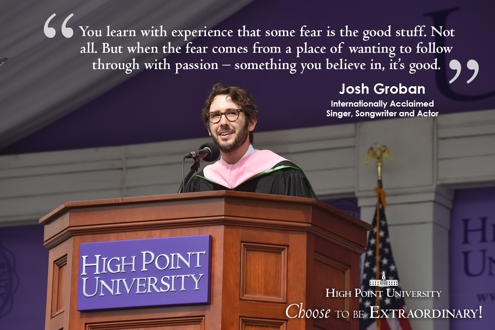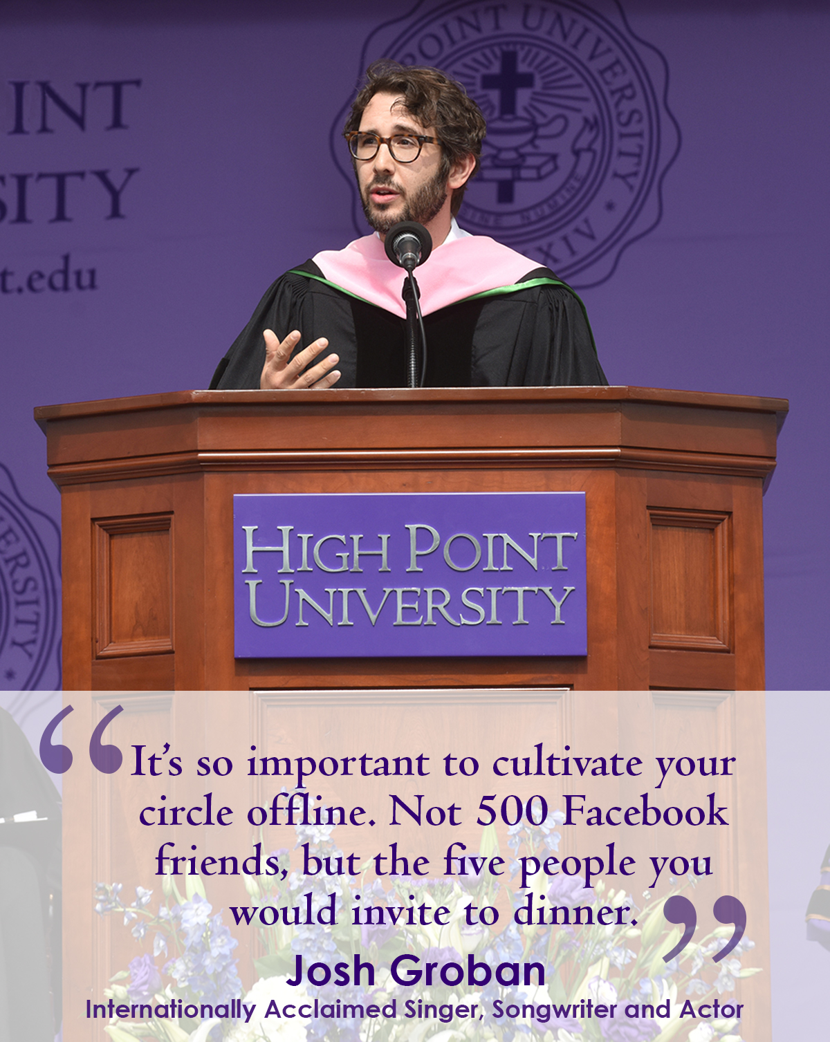 Commencement may have come and gone, but Josh Groban’s words of wisdom, which he shared with High Point University’s Class of 2018 are timeless. He challenged the graduating seniors to face their fears, cultivate their network of support and to trust their instincts.