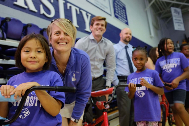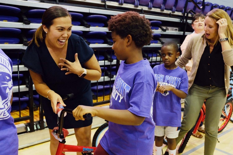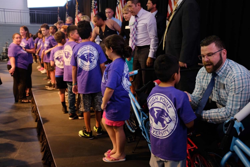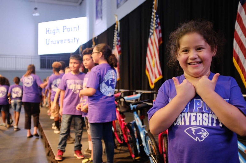 Today, those bikes were donated to local children, all of whom are participants in day camps at the Carl Chavis YMCA and the High Point YWCA. The children were brought to campus on HPU buses for the surprise event.