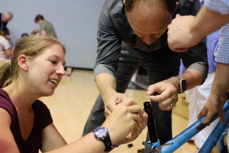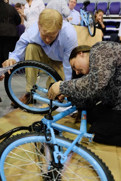 “This was the culmination of everything. We worked together as a faculty and staff team to build this bike together,” says Doug Hall, assistant director of Career and Professional Development Office. “We didn’t expect this was something we were going to be doing coming in, but knowing that we were getting together to build bikes, knowing that we were going to give them to children who we would actually get to see, I didn’t see that one coming. That was exciting.”