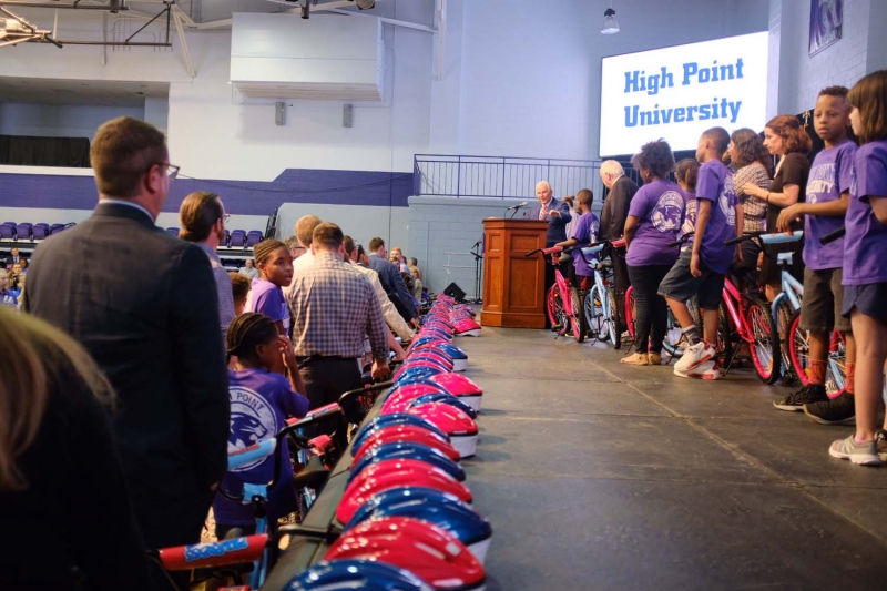 “I’ve told you before that High Point University is High Point’s University,” HPU President Nido Qubein told the crowd at today’s event. “We have done so many things in this community. More than one million hours of student volunteerism alone has served practically every nonprofit in this community. We have hundreds of you who are serving and volunteering. As much as we do, we must do more. And this school is dedicated and committed to continuing that. Sometimes there are children out there whose lot in life is not as good as they’d like it to be. So our staff and faculty came together on Tuesday, built these bikes, and then collectively decided to give these bikes to children in this community who do not have a bike. It is symbolic of what this university stands for – to help others when you can, to reach beyond yourself and plant a seed of greatness in the life of another human being.”