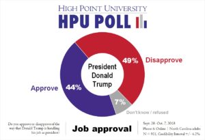 HIGH POINT, N.C., Oct. 9, 2018 – A High Point University Poll finds that North Carolinians give President Donald Trump a job approval rating of 44 percent and Gov. Roy Cooper a job approval rating of 52 percent. The survey also finds that North Carolinians are split on who they would vote for in U.S. Congressional races if they were held today.