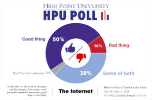 The most recent HPU Poll was fielded by live interviewers at the High Point University Survey Research Center calling on Oct. 26-Nov. 1, 2018 and an online survey fielded at the same time. The responses from a sample of all North Carolina counties came from a total of 842 adults who were either interviewed online (285 respondents) and landline or cellular telephones (557 respondents). The Survey Research Center contracted with Survey Sampling International to acquire these samples, and fielded the online survey using its Qualtrics platform. This is a combined sample of live phone interviews and online interviews. The online sampling is from a panel of respondents, so their participation does not adhere to usual assumptions associated with random selection. Therefore, it is not appropriate to assign a classical margin of sampling error for the results. In this case, the SRC provides a credibility interval of plus or minus 4.1 percentage points to account for a traditional 95 percent confidence interval for the estimates (plus or minus 3.4 percentage points) and a design effect of 1.2 (based on the weighting). The data is weighted toward population estimates for age, gender, race, and education level based on U.S. Census numbers for North Carolina. Factors such as question wording and other methodological choices in conducting survey research can introduce additional error into the findings of opinion polls. Details from this survey are available at http://www.highpoint.edu/src/files/2018/11/62memoA.pdf.