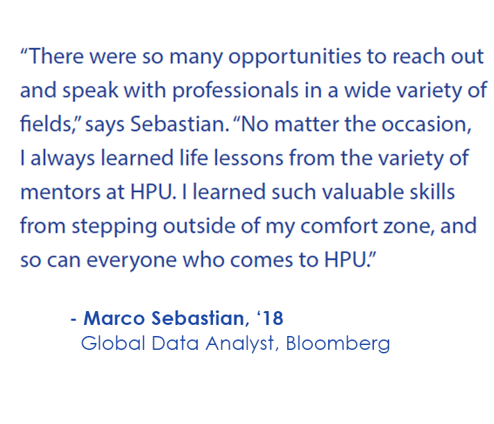 During fall break of his senior year, Sebastian joined the HPU in the City trip to New York. That’s where he met executives at Bloomberg. He was inspired by the company’s phenomenal success and decided to pursue a career there. After he graduated in 2018, he joined Bloomberg in New York as a Global Data Analyst.