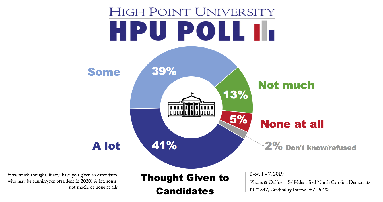The HPU Poll also finds that interest in the Democratic primary field hasn’t changed since the September HPU Poll, when 41% of self-identified Democrats in North Carolina said they have given a lot of thought to candidates who may be running for president in 2020. Just over half (63%) of self-identified Democrats surveyed said they have watched at least some of the Democratic presidential campaign debates.