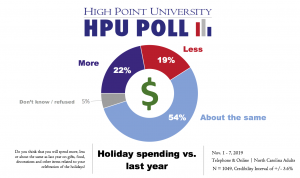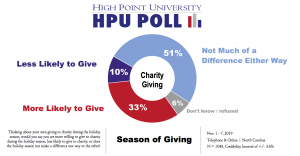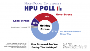 “Over half of North Carolinians are telling us that the holiday season doesn’t make much difference in their stress levels,” says Brian McDonald, associate director of the HPU Poll and adjunct professor. “However, larger percentages are still saying that the holidays do not make much difference in their stress level or charitable gifts.”