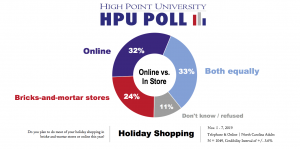When North Carolinians do shop for the holidays, they are split as to whether they plan to do most of their shopping at brick-and-mortar stores (24%) or online (32%). An additional one-third (33%) of respondents said they will do both equally. The proportion of shoppers going online hasn’t changed must since last year, when 35% said they would do most of their shopping online, and 25% said they would do most of their shopping at brick-and-mortar stores, according to the 2018 HPU Poll.