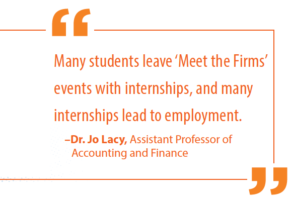 “Our department also hosts ‘Meet the Firms’ events, where students can learn directly from firm leaders on our campus. Many students leave these events with internships, and many internships lead to employment.”