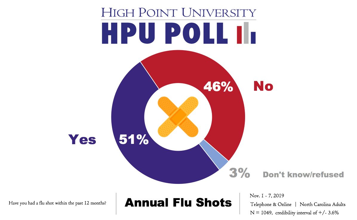 HIGH POINT, N.C., Dec. 17, 2019 – The most recent HPU Poll finds that just over half (51%) of North Carolina residents surveyed said they had a flu shot within the past 12 months. The HPU Poll reported a similar finding in February 2019, when 49% said they had a flu shot within the past 12 months.