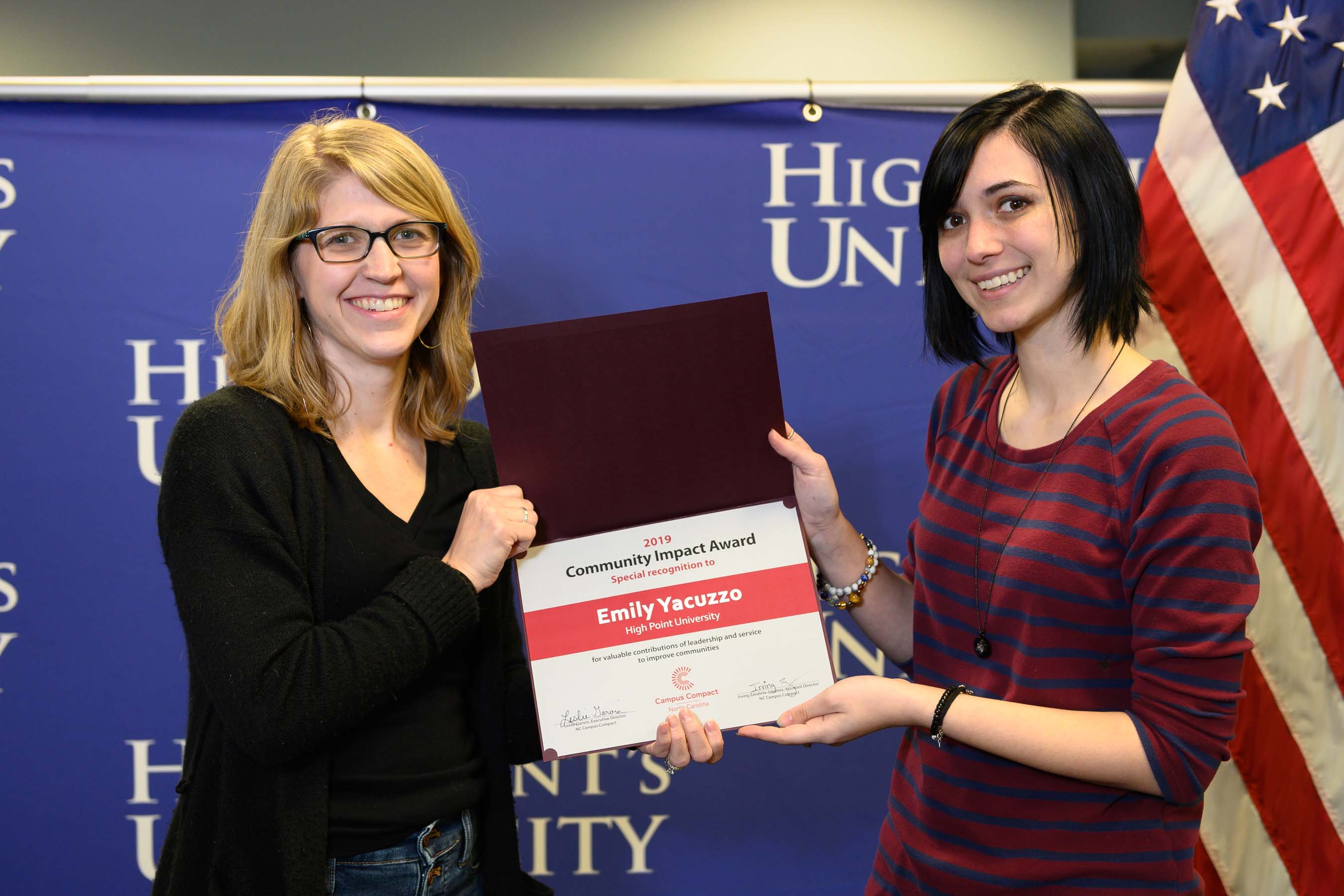 High Point University senior, Emily Yacuzzo, has been named the North Carolina Campus Compact’s winner for the 2019 Community Impact Student Award (CISA).