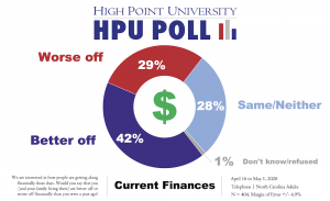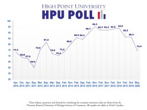 HIGH POINT, N.C., May 14, 2020 – According to the latest High Point University Poll, the Consumer Sentiment Index shows that North Carolinians’ opinions about the economy and their personal finances have dropped since last fall. The newest index, based on April-May 2020 HPU Poll data, is recorded at 74.4. That number is down 12 points from October 2019 when it was 86.4. The HPU Poll recorded 73.3 in April 2010, the first time the poll measured consumer sentiment in North Carolina.