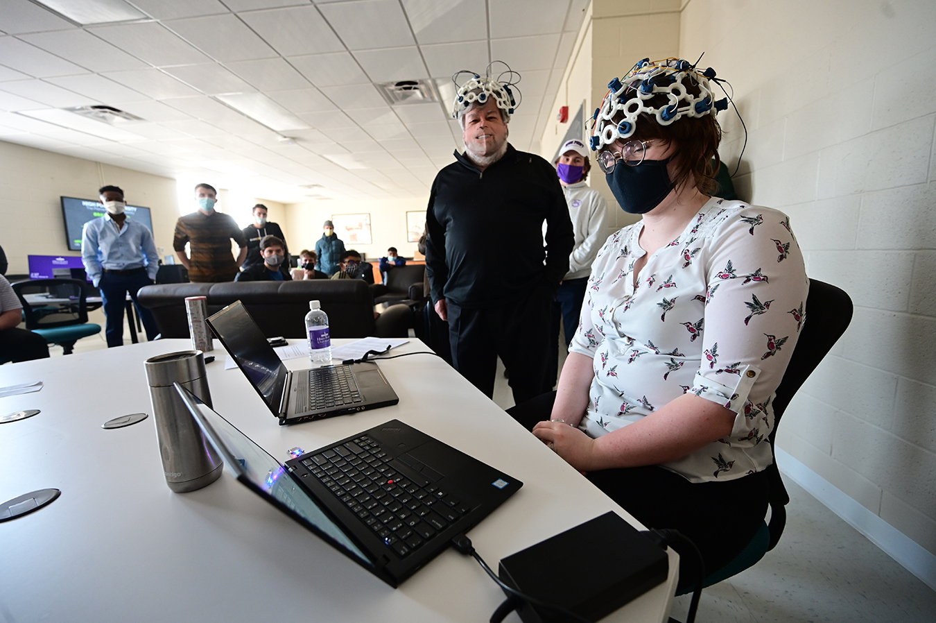 Students showed Steve Wozniak, HPU’s Innovator in Residence, their device that reads brainwaves.