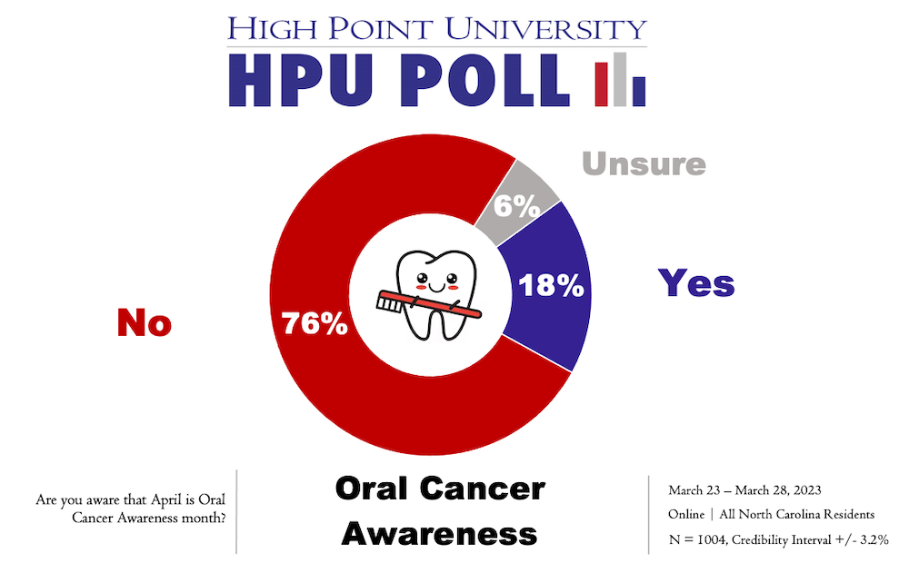 Over three-quarters (76%) of North Carolinians said they were not aware that April is Oral Cancer Awareness Month, while 18% said they were aware.
