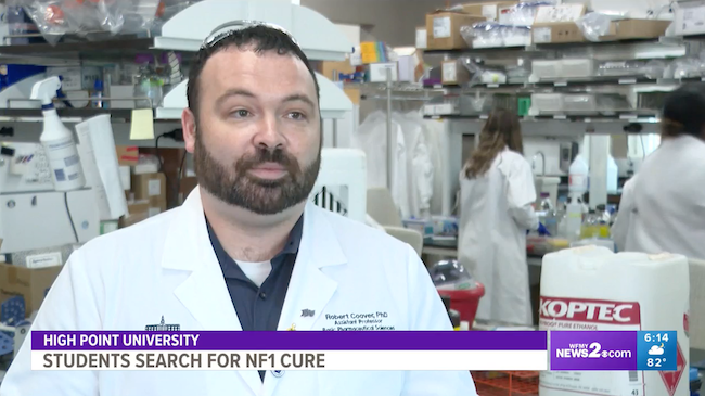 Dr. Robert Coover, assistant professor in High Point University’s Fred Wilson School of Pharmacy, and his students are researching treatments for a deadly inherited cancer, neurofibromatosis type 1 (NF1). Coover is passionate about the research because NF1 claimed the lives of his father and younger brother. HPU’s summer research opportunities provide Dr. Coover and his students the chance make a difference in the lives of others.