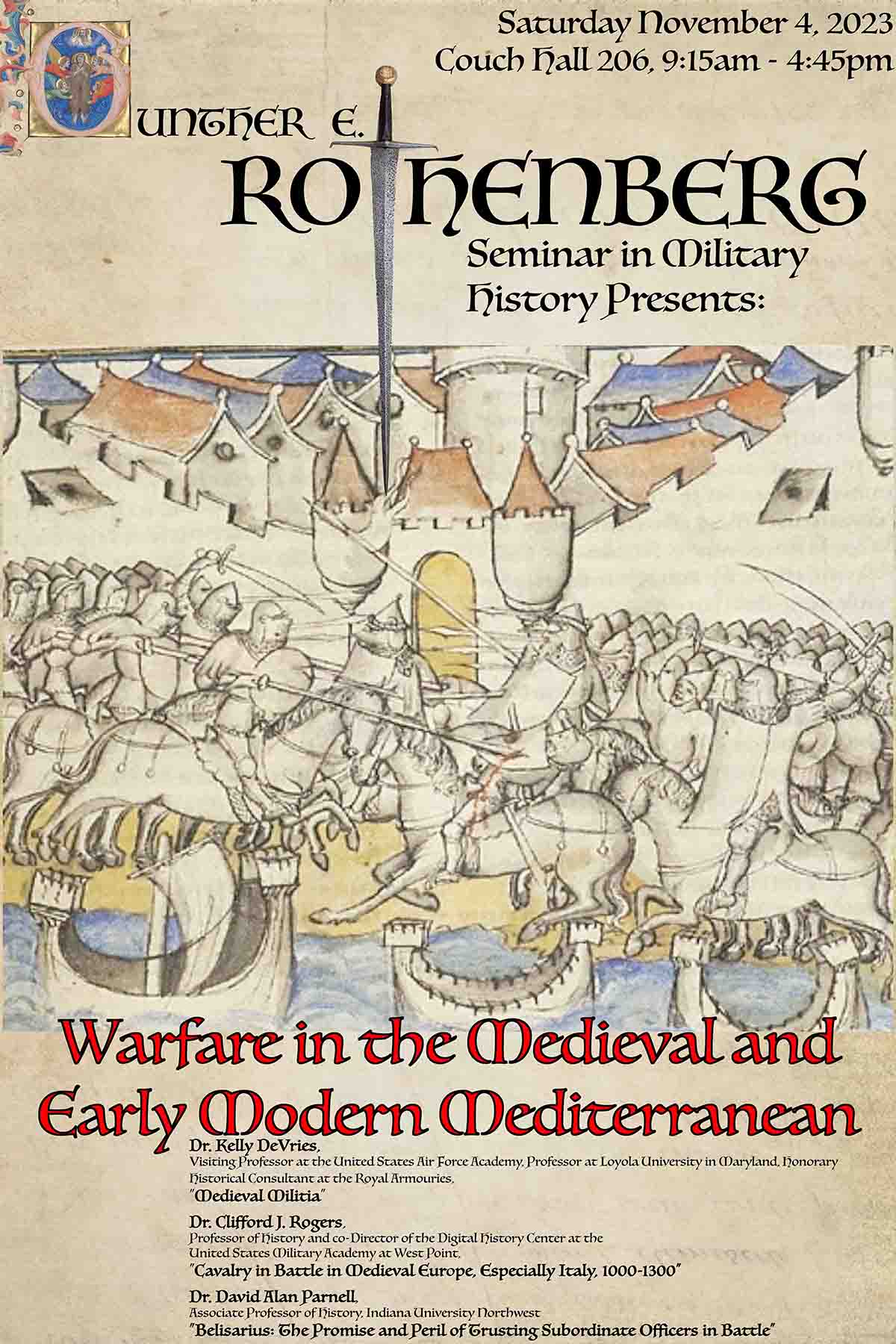 This year’s event will feature three scholars for the theme of “Warfare in the Medieval and Early Modern Mediterranean.” Dr. Kelly DeVries, a visiting professor of the U.S. Air Force Academy, a professor at Loyola University in Maryland and an honorary historical consultant at the Royal Armories, will present “Medieval Militia.” Dr. Clifford J. Rogers, a history professor and co-director of the Digital History Center at the U.S. Military Academy at West Point, will present “Calvary in Battle in Medieval Europe,” with a focus on Italy in 1000-1300. Dr. David Alan Parnell, an associate history professor at Indiana University Northwest, will present “Belisarius: The Promise and Peril of Trusting Subordinate Officers in Battle.”