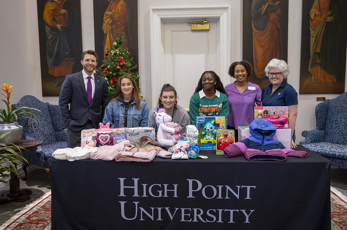From left, Rev. Dr. Preston Davis, minister to the university; Carly Zimmerman, philanthropy chair of HPU’s Board of Stewards; Keira McQuillan, president of HPU’s Board of Stewards; Joy Adjei, a member of HPU’s Board of Stewards; Rev. Andria Williamson, HPU chapel programs manager; and Laura Hayden, Angel Tree Program coordinator of the Salvation Army of High Point, are pictured with a few of the toys and gifts.