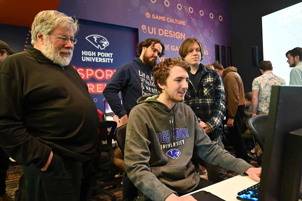 Following his seminar, Wozniak met with a group of HPU students majoring in game design inside the Nido R. Qubein School of Communication. He mentored the students during a game design workshop and offered advice and words of encouragement while viewing the video games they had designed.
