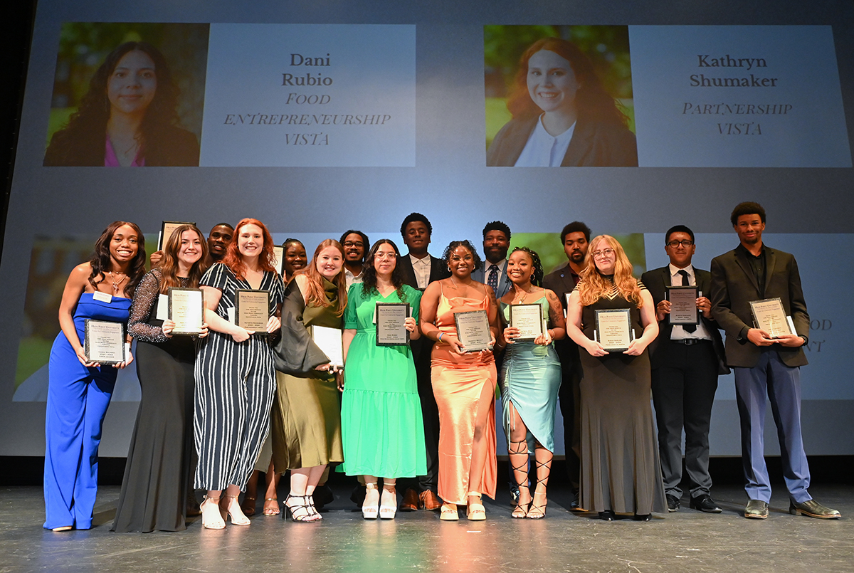 VISTA Leaders Iyanna Salters and Dihandra Williams recognized this year’s record number of 16 HPU VISTAs. In addition to Salters, Williams and Grant Hines, they are Hassan Allah, Sarah Barlow, Josh Cameron, Martin Enriquez, Abby Forrence, Ja’Niya Rice, Lauren Riley, Dani Rubio, Kathryn Shumaker, Kyle Smith, Demetri Turner and Marecia Wright. Each VISTA works with a nonprofit in High Point to build sustainable programs to address needs, such as food insecurity and education.