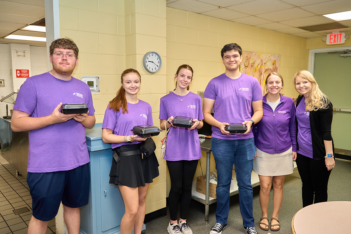 Pictured from left are HPU pharmacy students Jacob Blalock, Jess Moniuszko, Nikki Williams and Andrew Faircloth with faculty Dr. Stacey Cutrell and Dr. Courtney Bradley as they prepared to hand out meals at Open Door Ministries.