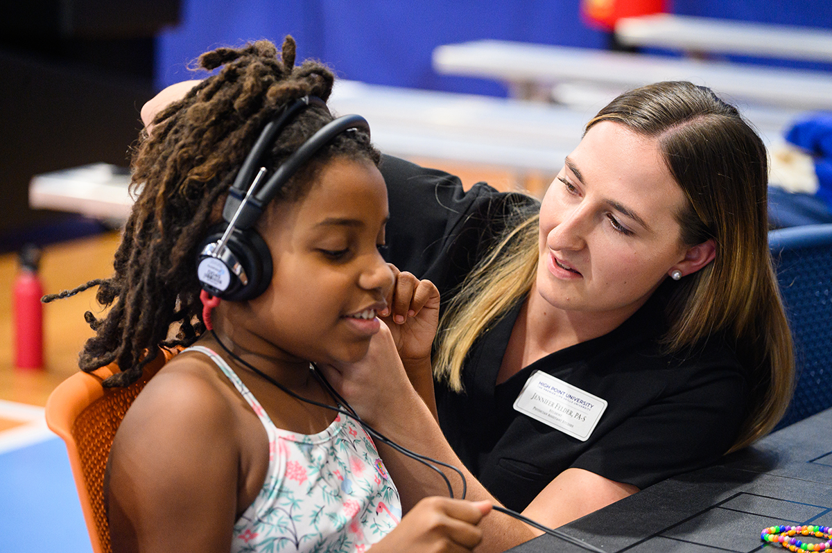 Physician Assistant students recently conducted vision and hearing screenings for third- through fifth-grade students at the Boys and Girls Club of Greater High Point. Pictured at right is Jennifer Felder, a physician assistant student, adjusting a girl’s headphones for a hearing test.