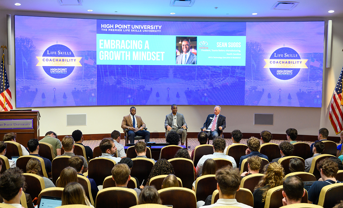 High Point University students filled the Callicutt Life Skills Theater to learn from Sean Suggs, president of Toyota Battery Manufacturing North Carolina and HPU’s Technology Executive in Residence, during his visit to campus on Feb. 4. Pictured from left during the Q&A were James Fakunle, assistant professor of entrepreneurship, with Suggs and Dr. Bradley Venable, chair of HPU’s Department of Management and professor of supply chain management.