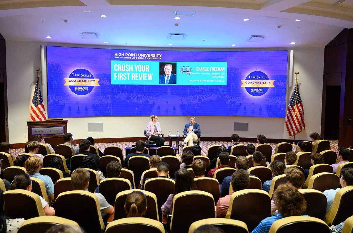 Charlie Freeman, president of business operations for the NBA’s Orlando Magic and High Point University’s Sport Business Executive in Residence, recently shared career advice and encouraged HPU students to accept and learn from job reviews. Pictured were Dr. Arden Slavov, assistant professor of sport management, and Freeman during a Life Skills and Leadership Series session titled “Crush Your First Review.”