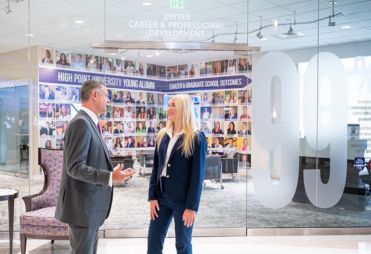 Mark Bradburn, the founder and co-managing financial advisor of The Bradburn Group at Morgan Stanley and High Point University’s Wealth Management Innovator in Residence, is pictured in the university’s Dwyer Career and Professional Development office with Lily Nelson, a Class of 2024 alumna who accepted a job as an analyst with Morgan Stanley in New York before she received her MBA at HPU in 2025.