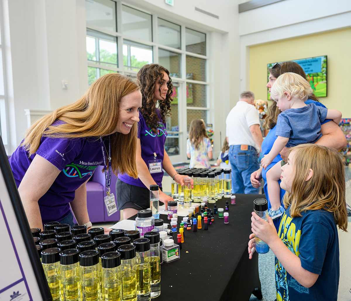 High Point University students and faculty recently shared fun science activities with local children and families at the Nido and Mariana Qubein Children’s Museum during the second annual SciQuest Spectacular. Pictured at left were Dr. Briana Fiser, dean of the Wanek School of Natural Sciences, and HPU student Lauren Rumble, as they discussed lava lamps with children in the Qubein Children’s Museum lobby.